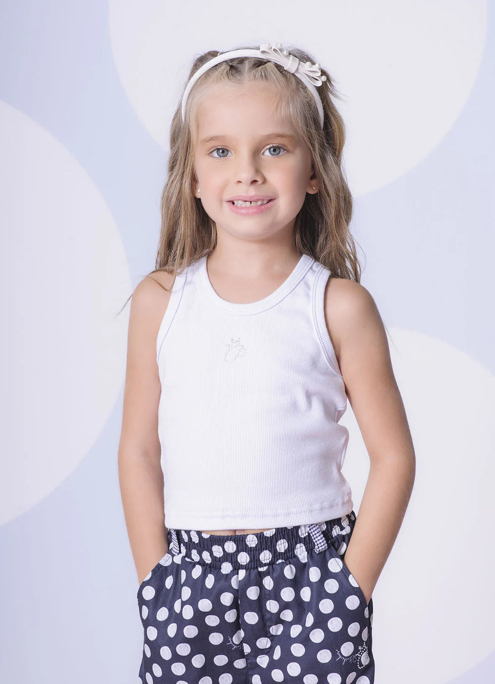 Blusa infantil regata cropped de ribana com logo em cristais Pituchinhus. Atemporal e confortável, perfeita para compor looks com outras peças da coleção.