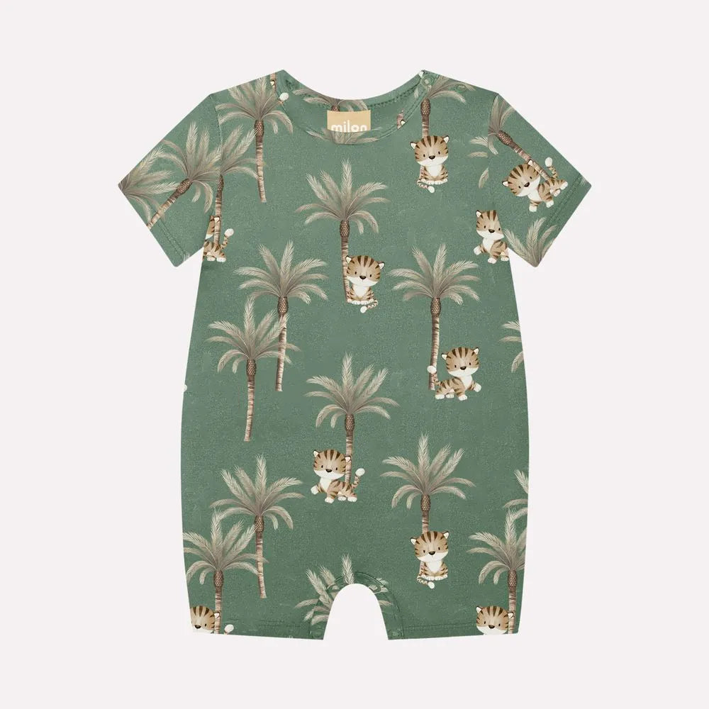 Um estampa alegre de tigrinhos brincando entre palmeiras, em tons de verde e marrom, adiciona charme e diversão à peça. Com decote em debrum, abertura no ombro e entrepernas com botões, proporciona praticidade na hora de vestir e nas trocas de fraldas.