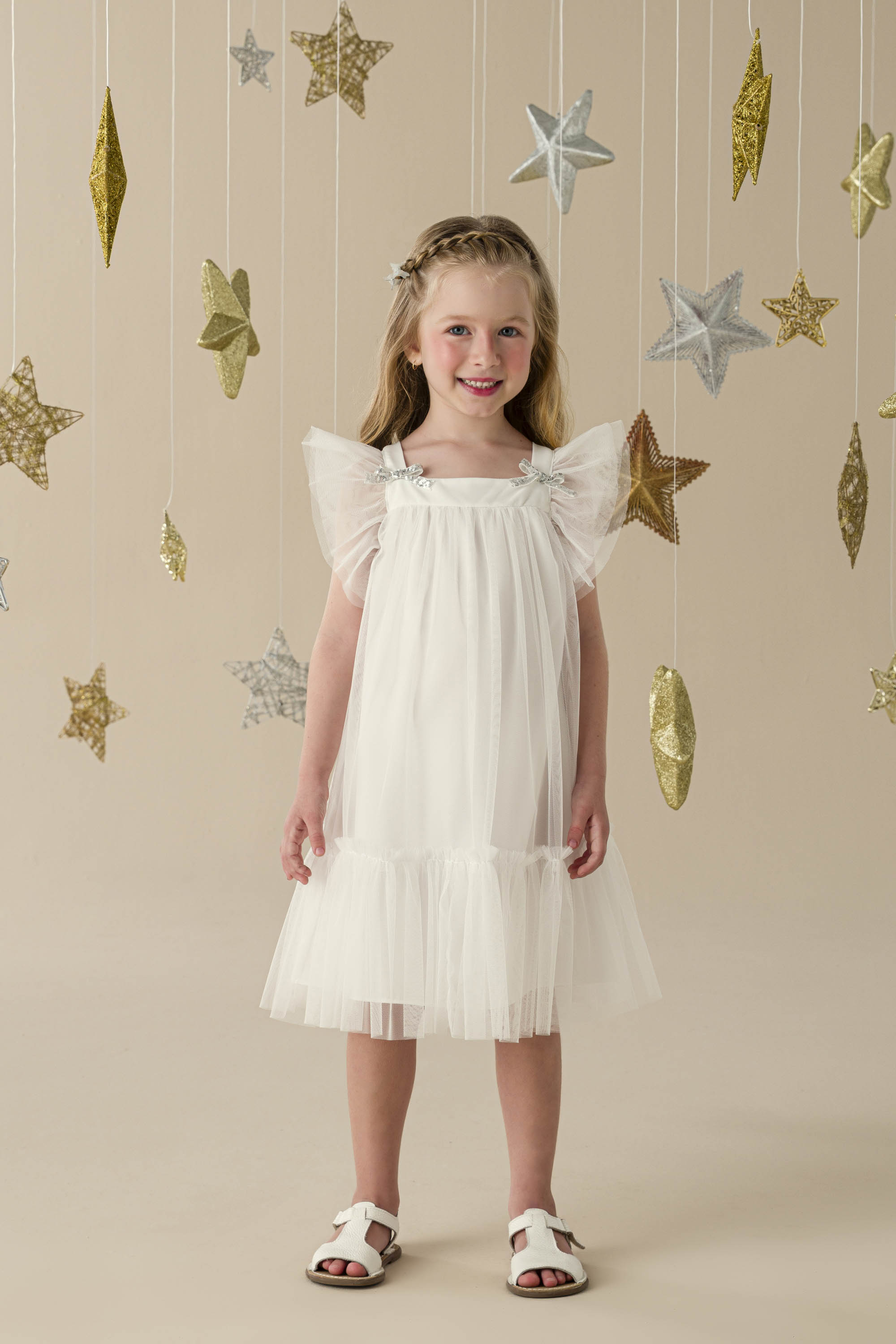 O vestido infantil de tule Mon Sucré encanta com sua delicadeza e movimento. Confeccionado em tecido leve com sobreposição de tule, apresenta camadas suaves na parte superior, alças largas e aplicação de laço delicado com brilho sutil. A saia fluida proporciona um caimento gracioso, tornando-o perfeito para ocasiões especiais e momentos inesquecíveis.