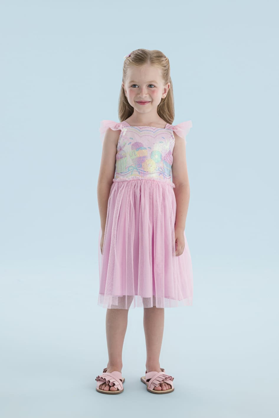 Vestido infantil Mon Sucré em tule rosa vibrante, com modelagem soltinha e camadas delicadas que garantem movimento e leveza ao visual. O decote quadrado é acompanhado de detalhes bordados na pala e alcinhas largas com babadinhos em camadas, trazendo ainda mais charme ao look. Ideal para ocasiões especiais, festas ou para momentos em que a sua pequena quer se sentir uma verdadeira princesa.