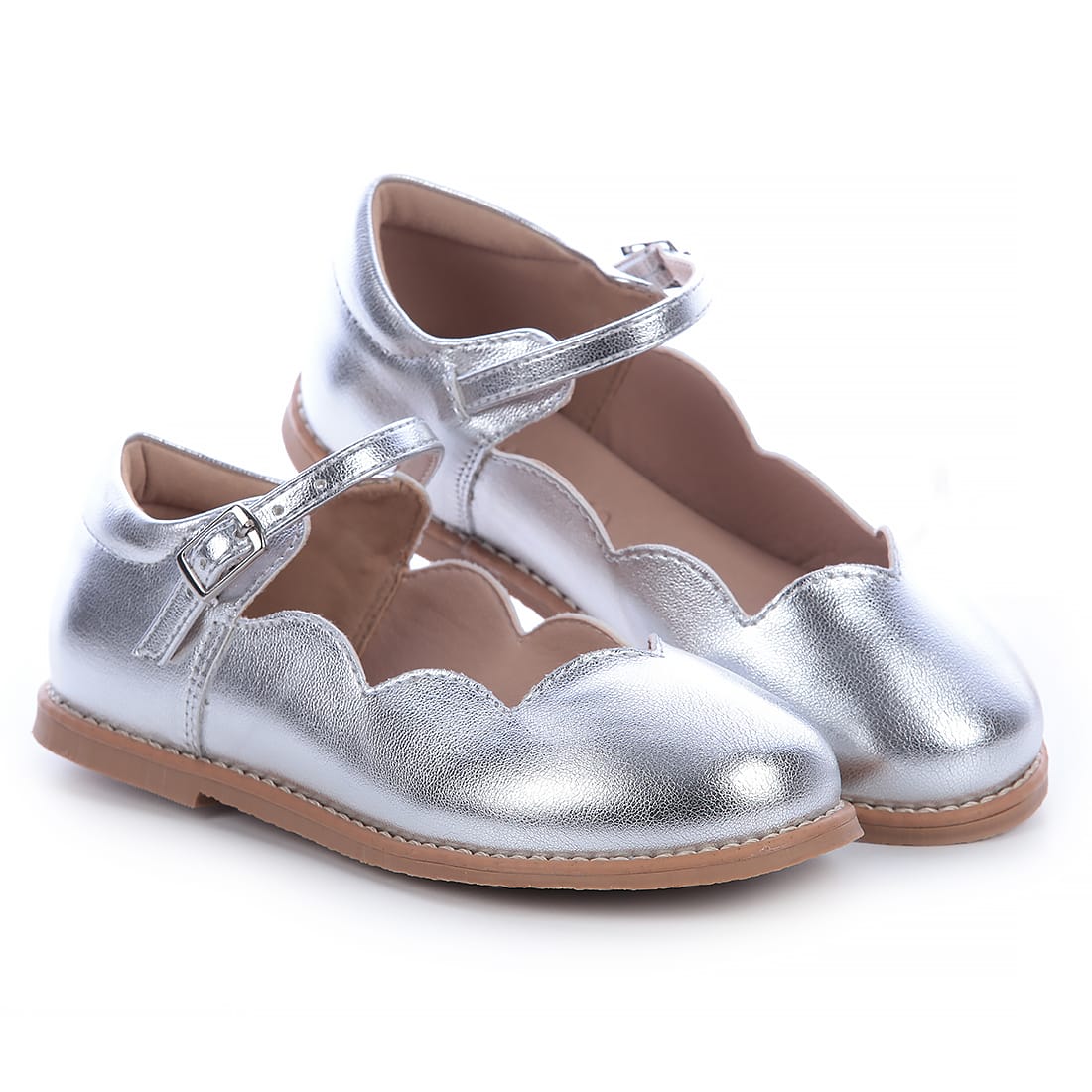 Sapatilha prata Buá com delicado acabamento contornando o peito dos pés. Acabamento interno em cacharrel, fechamento com fivela, solado estilo europeu com vira e solado TR (aderência e segurança no caminhar).