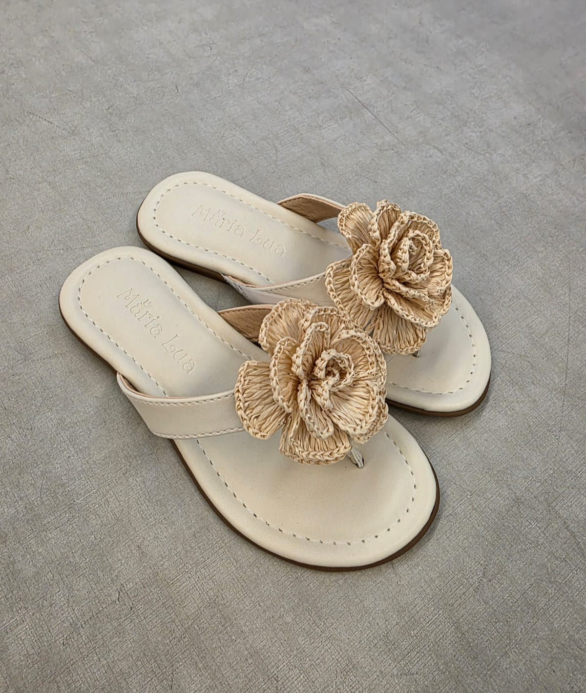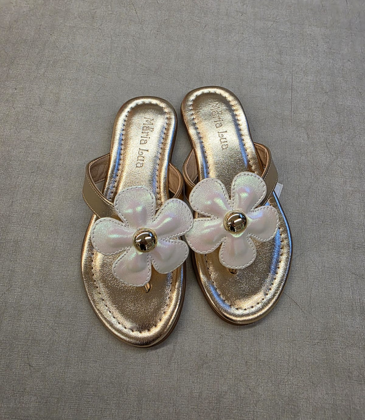 Rasteira dourada com uma maxi flor branca holográfica dando um toque de charme. Palmilha almofadada para maior conforto dos pés e solado TR (aderência e segurança no caminhar).