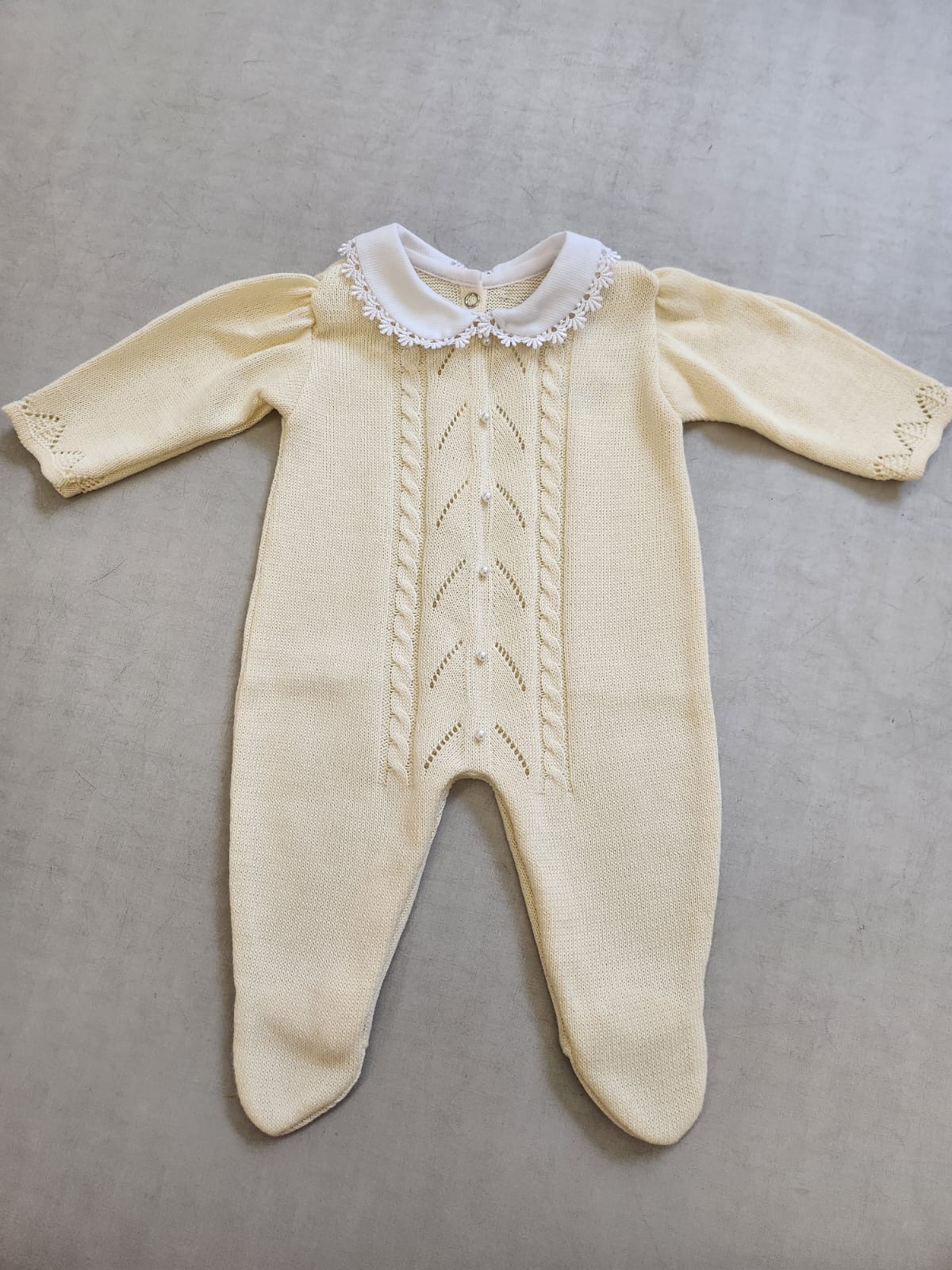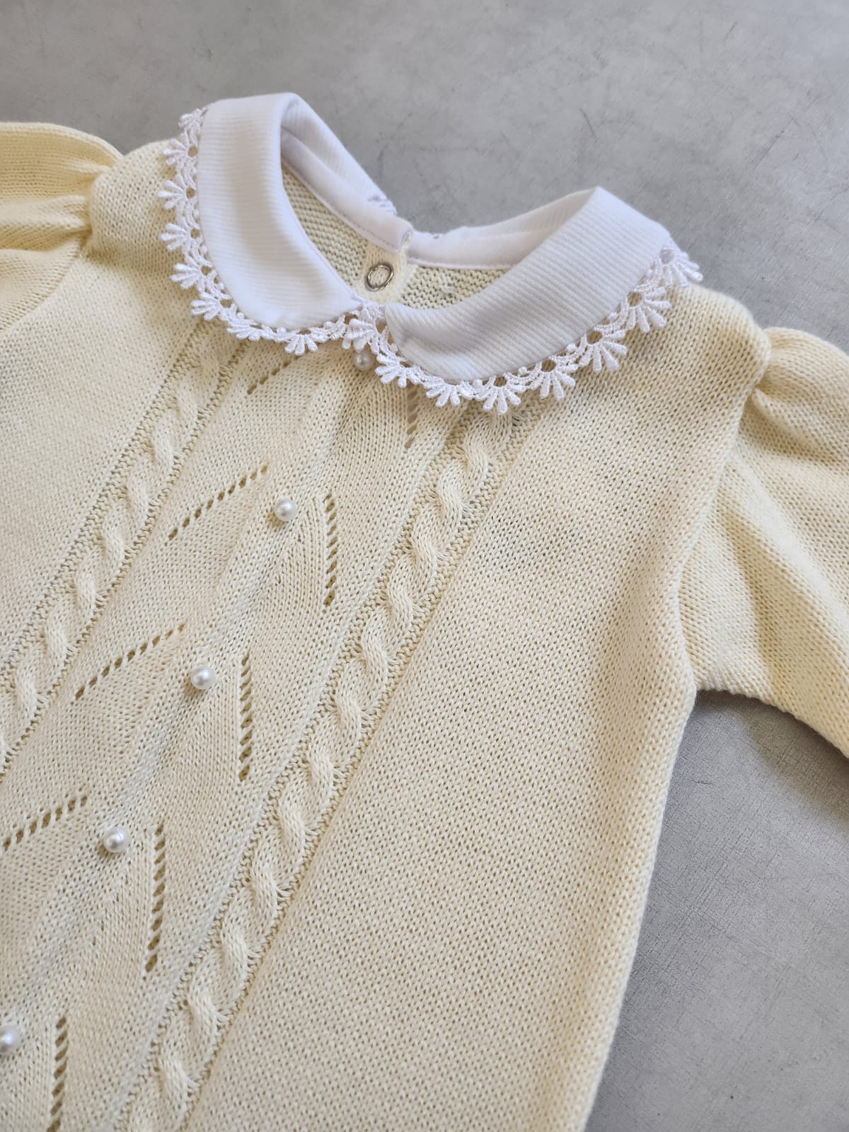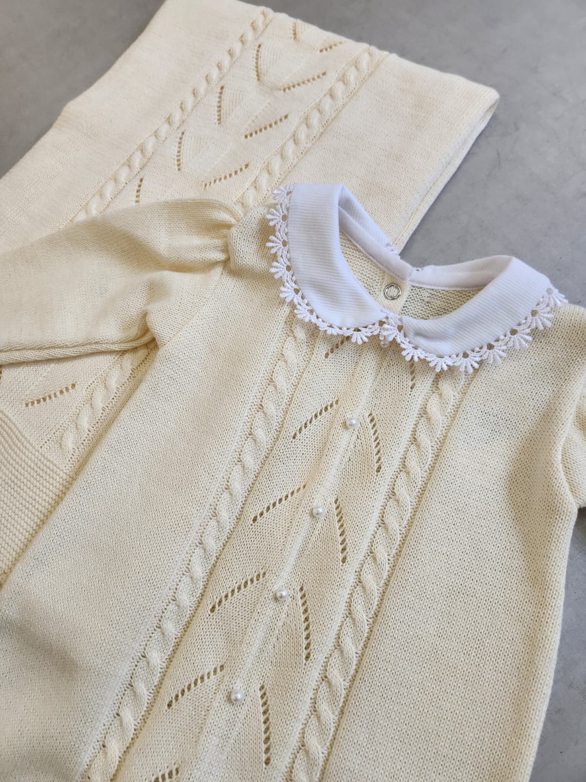 Saída maternidade BUÁ em tricot tramado na cor amarelo claro composta por macacão e manta. O macacão possui linda gola em tricoline branca e renda, detalhes em pérolas e abertura total na parte inferior com colchetes para facilitar a troca de fraldas. Super elegante essa saída é perfeita para acompanhar os primeiros dias da sua pequena. Manta com dimensão de 0.80x0.80cm.