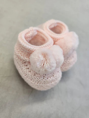 Sapatinho em tricot vermelho tramado com detalhe de pompons. Indicado para recém nascidos. Tamanho único.
