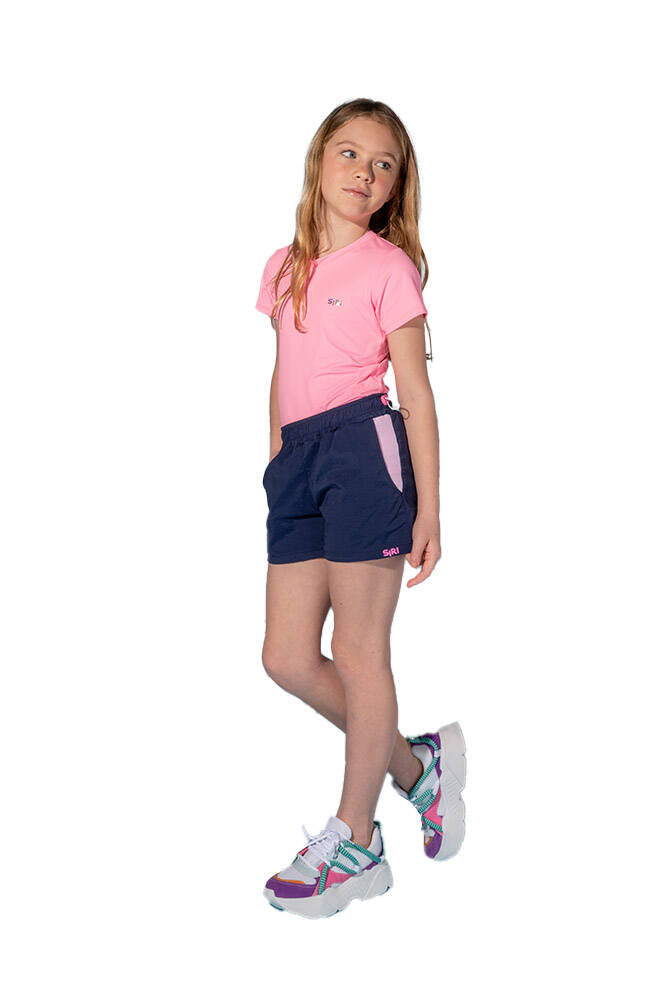 Conjunto marinho com rosa da linha Sport Siri composto por short e blusa manga curta. O short possui bolso lateral e shortinho em lycra rosa por dentro da peça. Essa linha foi desenvolvida para proporcionar conforto e versatilidade, sendo confeccionada em lycra UV50+ leve e confortável.
