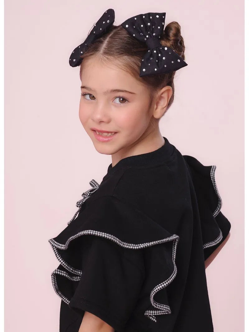 Blusa moletom Pituchinhus. Gola redonda e manga curta. Aplicação de debrum nos babados. Aplicação de laços laterais e cristais na logo da marca. Linda e confortável.