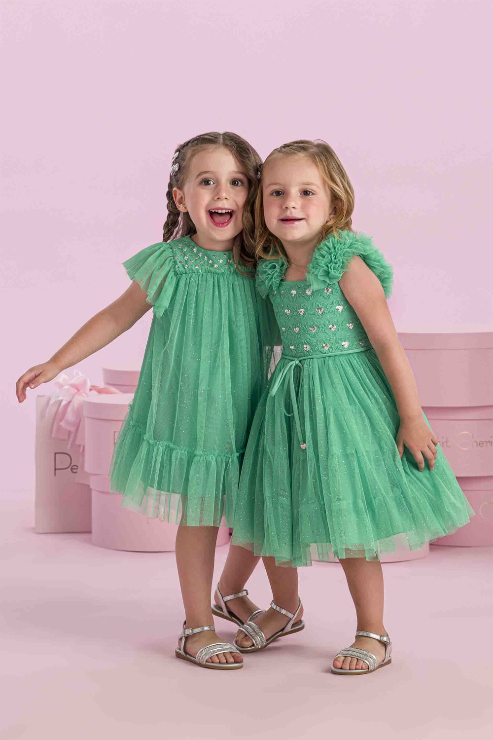 O vestido infantil Petit Cherie verde em tule é uma escolha encantadora e sofisticada para ocasiões especiais. Seu design apresenta delicados bordados na região do busto, que criam uma moldura romântica e fluida. O tule com aplicação de pequenos brilhos proporciona um toque de magia e sofisticação ao look. Leve e confortável, este vestido é perfeito para aniversários, festas ou celebrações, destacando a elegância natural da sua pequena com um visual inesquecível. Uma peça atemporal que combina beleza e estilo com um acabamento impecável.