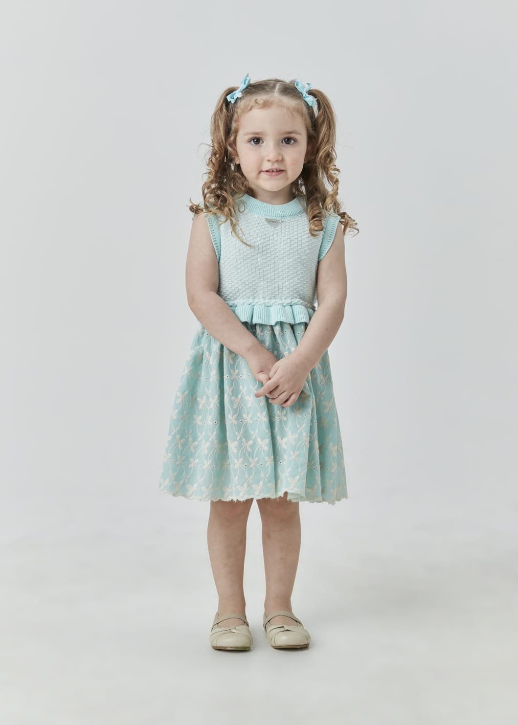 Vestido UM+UM linha baby em um tom de verde água super chique e elegante com saia em laise e corpo em tricot.