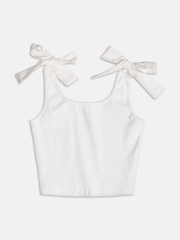 Os laços aplicados trazem um ar romântico para esse top de ribana off white. Com toque delicado e modelagem ajustada, ele é perfeito para produções que unem conforto e feminilidade.